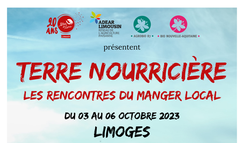 c’est ce que vous proposent Terre de Liens Limousin, l’Adear Limousin et Agrobio 87 en vous invitant à "Terre nourricière, les rencontres du manger local ", événement organisé du 3 au 6 octobre 2023 à Limoges par nos trois associations agissant pour le développement de l’agriculture paysanne et biologique en Limousin. En partenariat avec Limoges Métropole dans le cadre du Projet alimentaire territorial.
