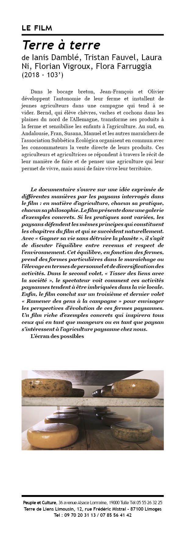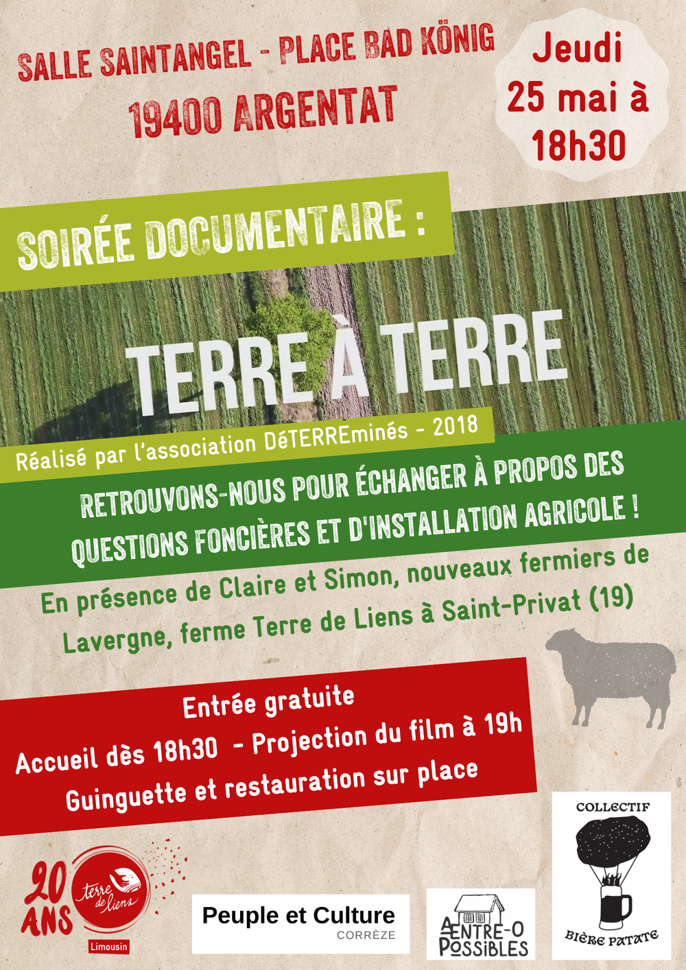 A l'occasion de l'installation de Claire et Simon sur la ferme de Lavergne à Saint-Privat, les bénévoles du groupe local Corrèze vous invitent jeudi 25 mai à Argentat à partir de 18h30 à une soirée autour du documentaire "Terre à Terre", réalisé par l'association DéTERREminés. Retrouvez-les pour échanger à propos des questions foncières et d'installation agricole !