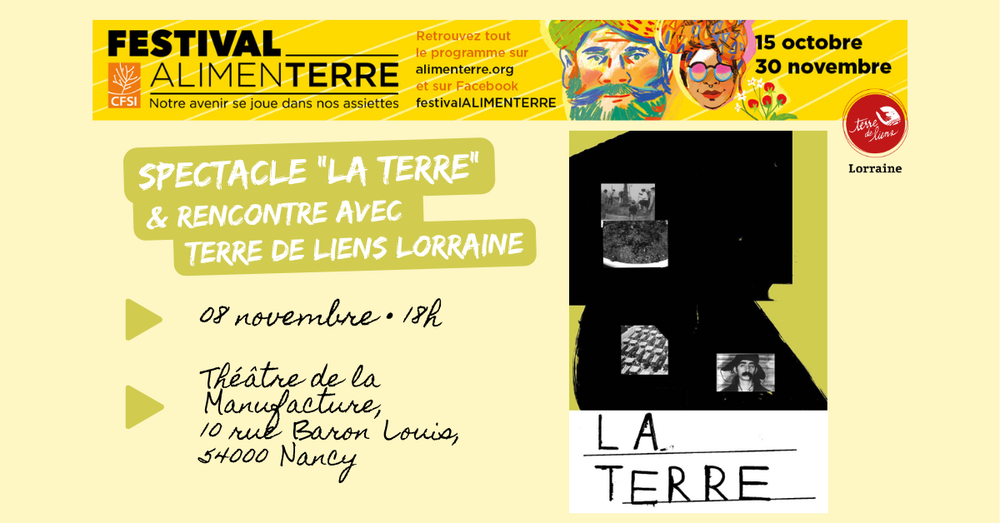 En collaboration avec le Théâtre de la Manufacture, Terre de Liens Lorraine vous invite à un temps d’échange d’une heure en amont du spectacle en présence de bénévoles Terre de Liens et de la metteuse en scène.