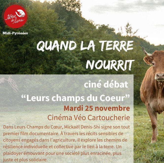 Dans le cadre du Festival ALIMENTERRE, nous vous invitons chaleureusement à une soirée ciné-débat autour du documentaire "Leurs Champs du Cœur", un film engagé qui donne la parole à celles et ceux qui cultivent la terre autrement.