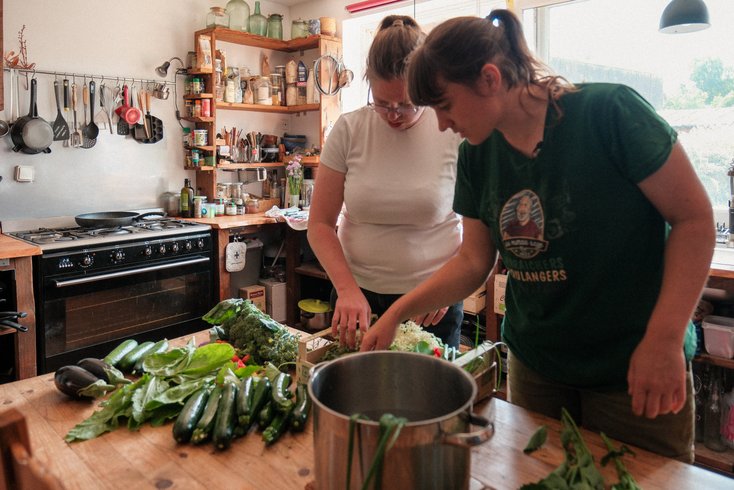 [Chloé Charles] Non, en fait, quand on dit "ce midi on mange vegan", il y a énormément de gens qui ont l’a priori de se dire que ça va être triste, ou peu nourrissant, ou fade. Alors que là, avec des courgettes, des concombres qui viennent d’être cueillis, les premières aubergines… C’est tellement bon qu’ils suffisent à eux-mêmes !