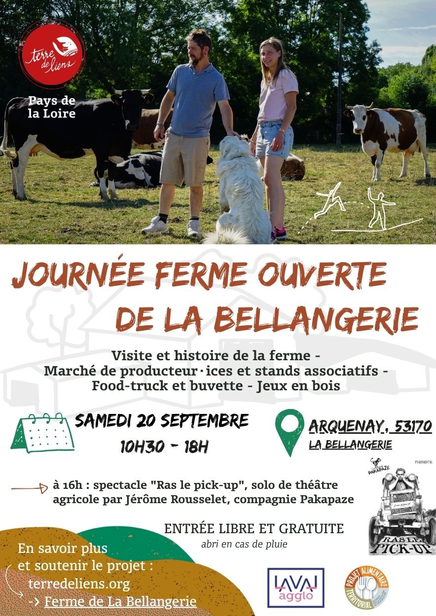 Clémence, Alexandre, Xavier et Terre de Liens Pays de la Loire vous invitent à venir célébrer la transmission réussie de la ferme de la Bellangerie près d’Arquenay (en Mayenne) le samedi 20 septembre 2025 de 10h30 à 18h.