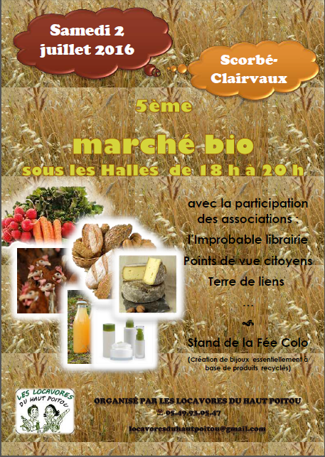 Ce marché réunira des producteurs bio, mais aussi des associations : L’improbable libraire, Points de vue citoyens, Terre de Liens ; et des créateurs : la Fée Colo (bijoux en matériaux recyclés).