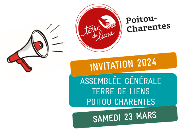 L’association Terre de Liens Poitou Charentes vous invite à participer à son Assemblée Générale qui aura lieu le samedi 23 mars à 10h. Elle se déroulera lde 10h à 16h30 au Lycée Agricole de l'Oisellerie (40 allée de l'Oisellerie, 16400 La Couronne)
