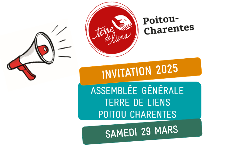 L’association Terre de Liens Poitou Charentes vous invite à participer à son Assemblée Générale qui aura lieu le samedi 29 mars. Elle se déroulera de 9h30 à 16h30 à La Scène Maria Casarès, 34 Boulevard Chasseigne 86000 POITIERS.