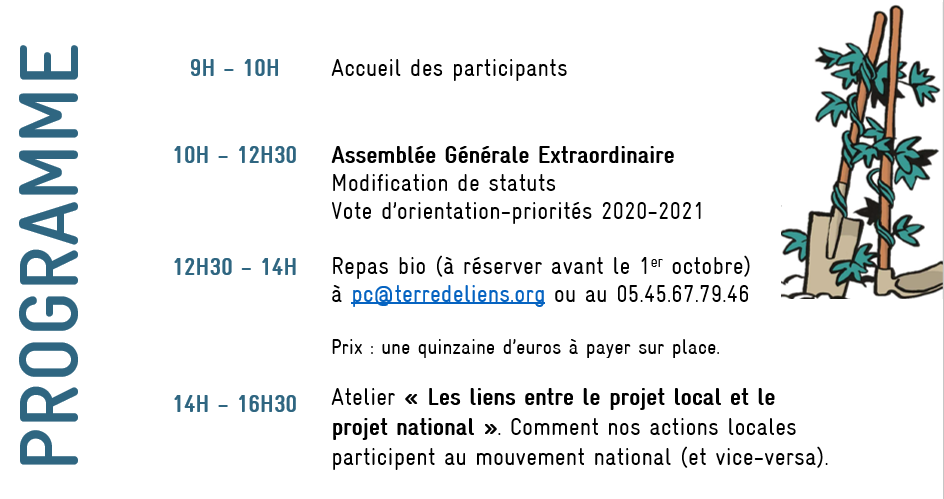 Inscription possible aussi à pc@terredeliens.org ou au 05 45 67 79 46