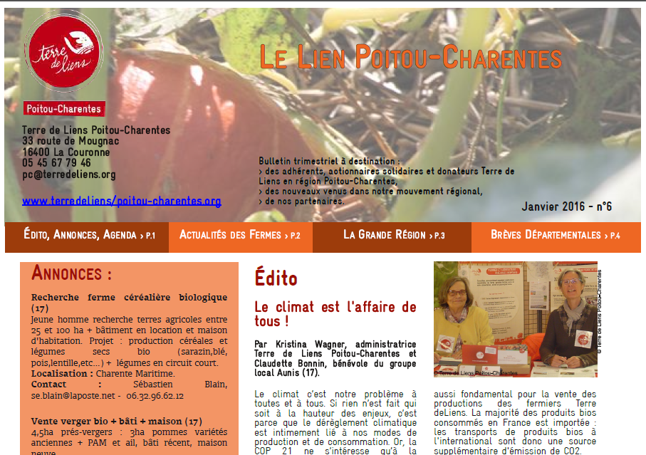 Terre de Liens Poitou-Charentes vous informe des dernières actualités de l’association.