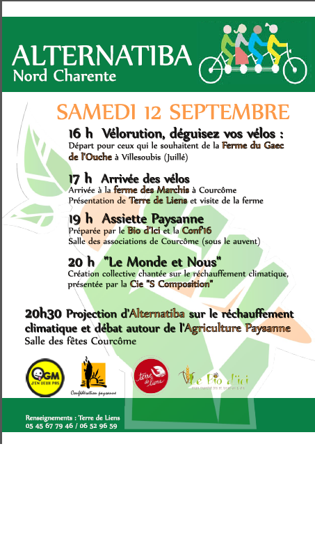 Terre de Liens Poitou-Charentes se joint au collectif Vigilance OGM, à la Confédération Paysanne et au groupement Le Bio d’Ici pour accueillir le tour Alternatiba en Nord Charente.