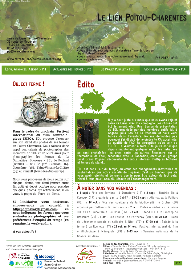 Quatre pages de petits articles et photos pour vous présenter les dernières nouvelles de Terre de Liens en Poitou-Charentes.