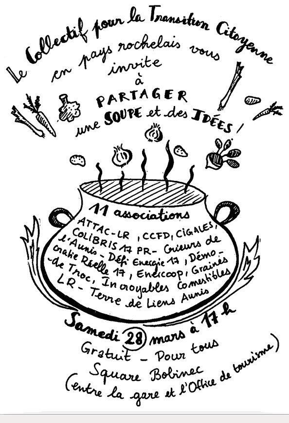 Nous vous donnons rendez-vous samedi 28 mars à 17h au square Bobinec entre la gare et l’office du tourisme pour partager notre première soupe mensuelle.