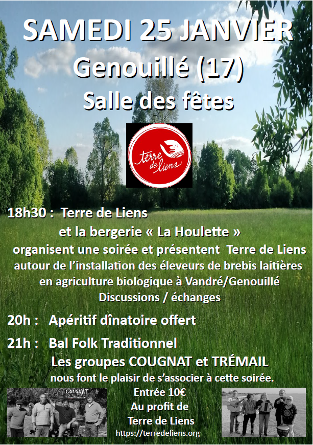 21.00 : La soirée se terminera par un bal folk traditionnel animé par les groupes Cougnat et Trémail. (entrée 10€ au profit de Terre de Liens)