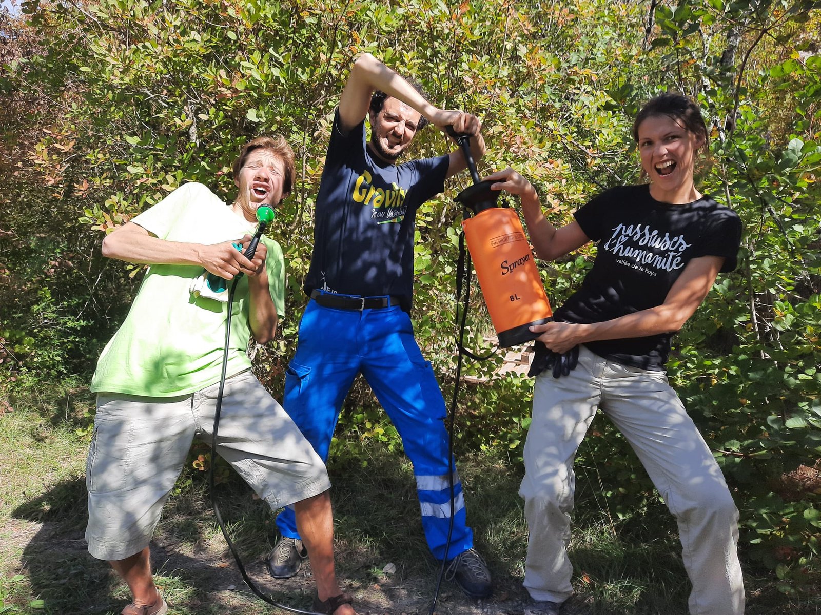 - Les EMa (ou micro-organismes efficaces activés) : Cette mixture de nombreuses souches microbiennes permet de régénérer le vivant. Ainsi, on les a vus rendre fertile les sols d'une ancienne déchetterie saturée de métaux lourds, ou permettre à une eau polluée de devenir claire très rapidement. Ici, l'idée était d'en pulvériser sur les zones qui vont accueillir les futurs rangs de vignes, et de nourrir ensuite ces bactéries avec du broyat.