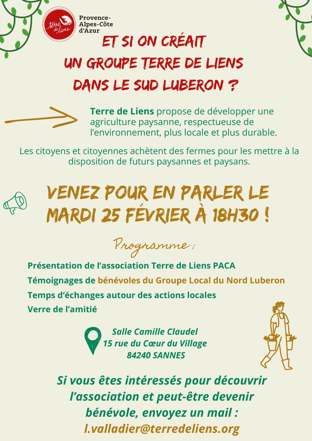 Pour plus d'infos et prise de contact : l.valladier@terredeliens.org