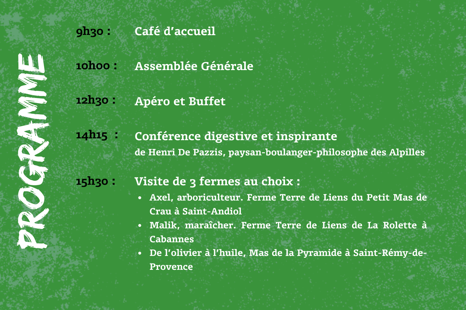 Temps fort de notre association, ne manquez pas ce rendez-vous annuel des adhérents, l’occasion de parcourir les actions réalisées, présenter les nouvelles fermes et envisager les projets stimulants pour l’année. Au programme : présentation à plusieurs voix le matin, buffet convivial, visites de fermes l’après-midi. Nous nous réjouissions de vous y voir.