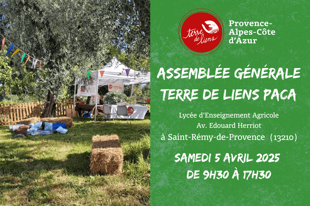 Nous sommes ravis de vous annoncer que l'assemblée générale de Terre de Liens PACA se tiendra le samedi 5 avril 2025 de 9h30 à 17h30 au :