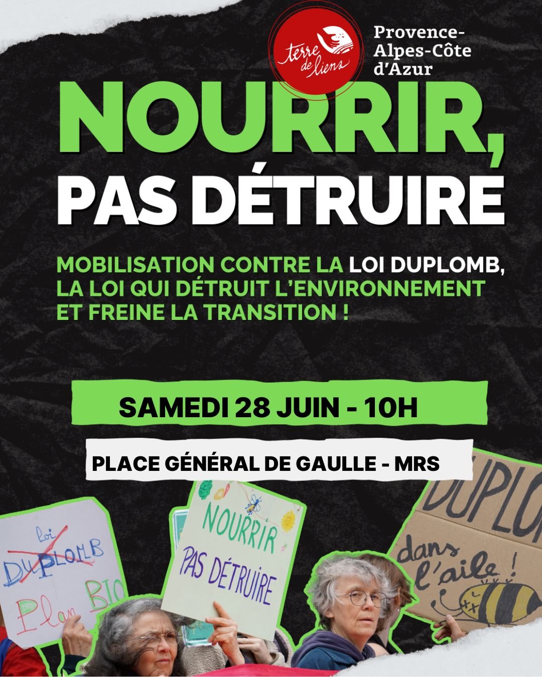 Samedi 28 juin, Terre de Liens PACA se joint à FNE Provence-Alpes-Côte d'Azur, LPO PACA, Asso.Colinéo pour vous inviter à participer à la manifestation contre la loi Duplomb !