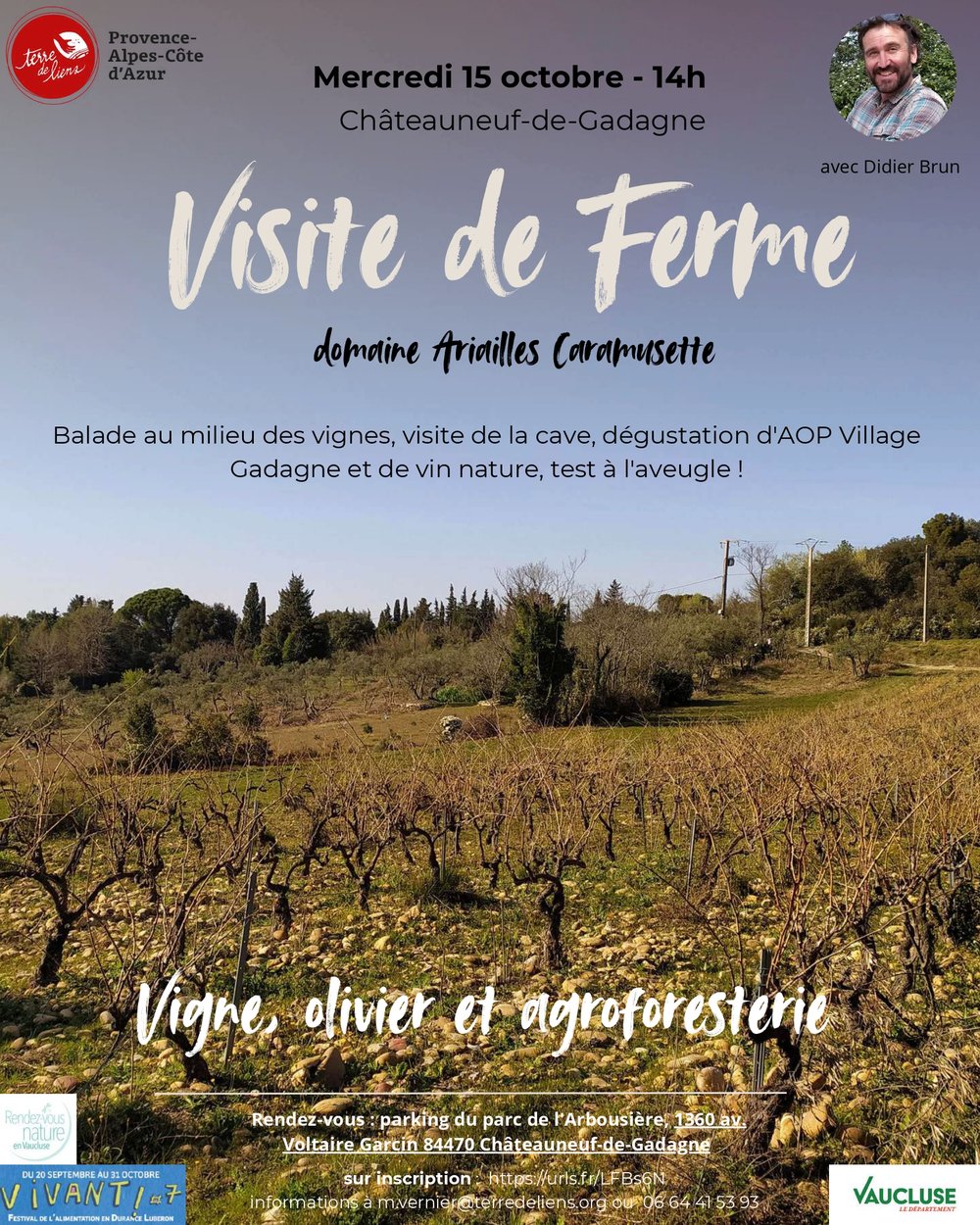 Mercredi 15 octobre, venez rencontrer Didier Brun, viticulteur bio et fermier de Terre de Liens sur le domaine Ariailles Caramusette, à côté d'Avignon ! Au programme : balade dans les vignes sur le plateau de Gadagne, visite d'une cave historique, dégustation de la cuvée 2025 en cours de fermentation, dégustation de vins à l'aveugle.