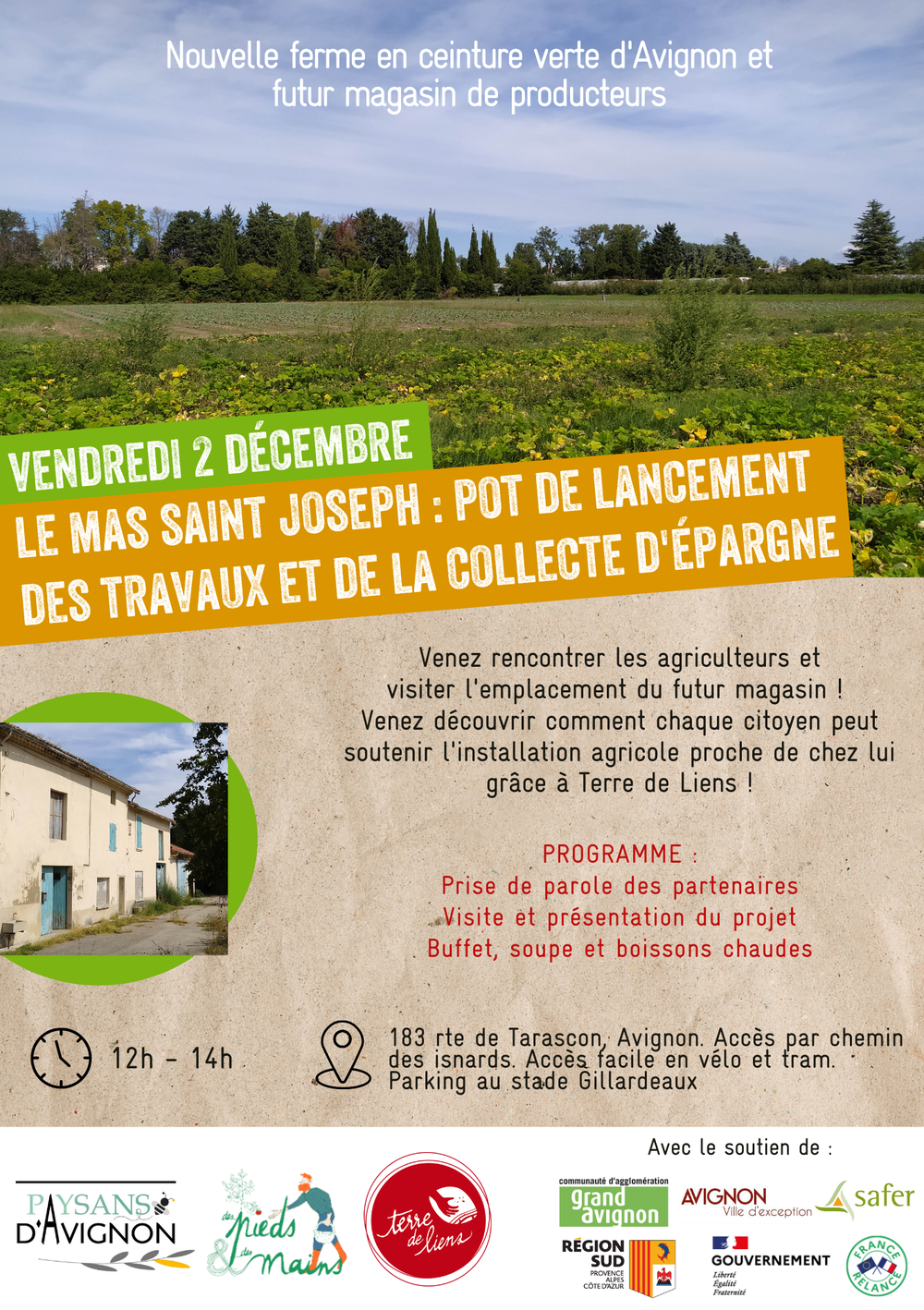 Vendredi 2 décembre à Avignon, une cinquantaine d'agriculteurs, élus, partenaires locaux, médias et citoyens se sont rassemblés devant le bâtiment du Mas St Joseph autour d'un buffet de bons produits locaux suite à l'invitation des partenaires du projet : l'association Paysans d'Avignon, la SCOP agricole Des pieds et des mains et Terre de Liens. C'était l'occasion de trinquer au chemin parcouru collectivement depuis plus de 2 ans, concrétisé par le lancement des travaux sur le mas, qui accueillera bientôt un magasin de producteurs, une plateforme de regroupement de produits pour livrer la restauration collective et des hangars agricoles. Et de communiquer sur la collecte d'épargne de Terre de Liens en cours pour cette ferme. Un beau moment convivial, RDV maintenant pour l'inauguration du magasin l'an prochain !
