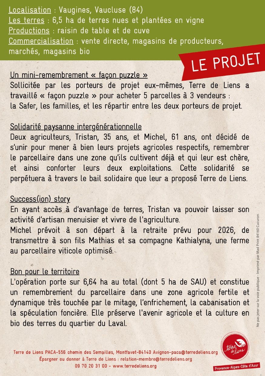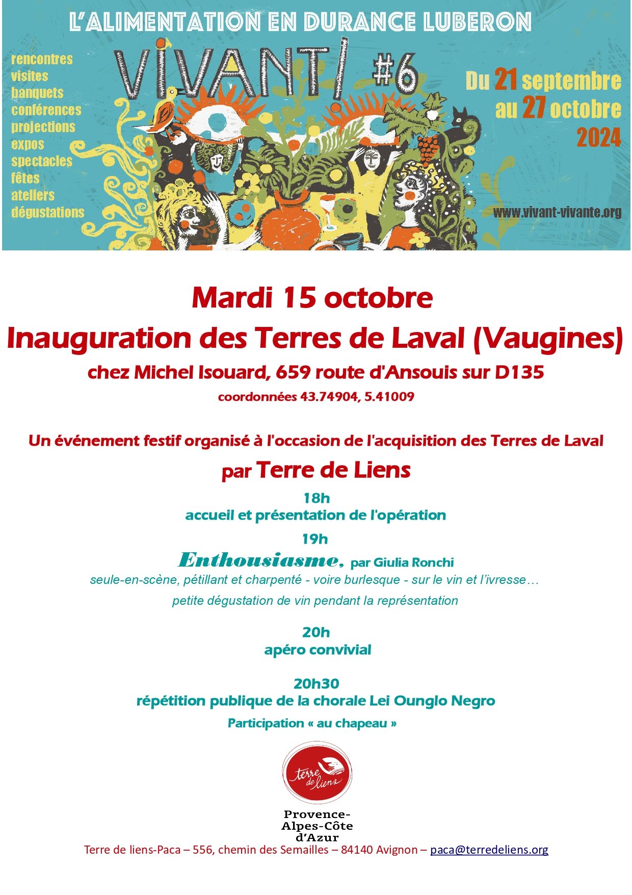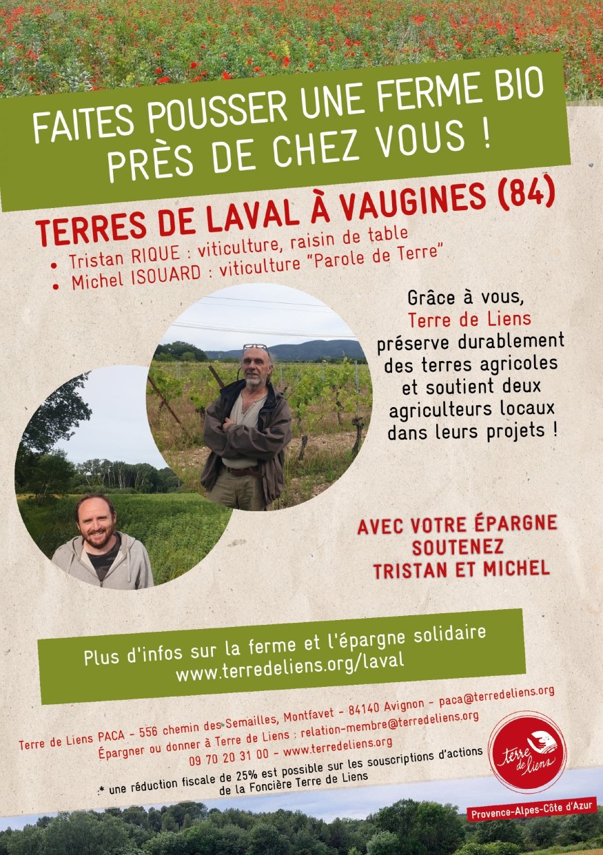 Mardi 15 octobre sera inaugurée l'acquisition par Terre de Liens des terres de Laval qui bénéficieront à 2 fermiers, Michel Isouard et Tristan Rique de Vaugines (Vaucluse).