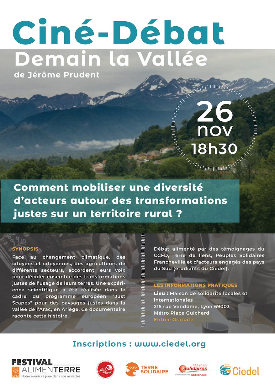 Le groupe local Terre de Liens de Lyon a le plaisir de vous inviter à un ciné-débat exceptionnel organisé, dans le cadre du festival ALIMENTERRE, en partenariat avec trois associations engagées, le CIEDEL, CCFD-Terre Solidaire et Peuple Solidaire Francheville, le 26 novembre à 18h30 à la Maison des solidarités à Lyon.