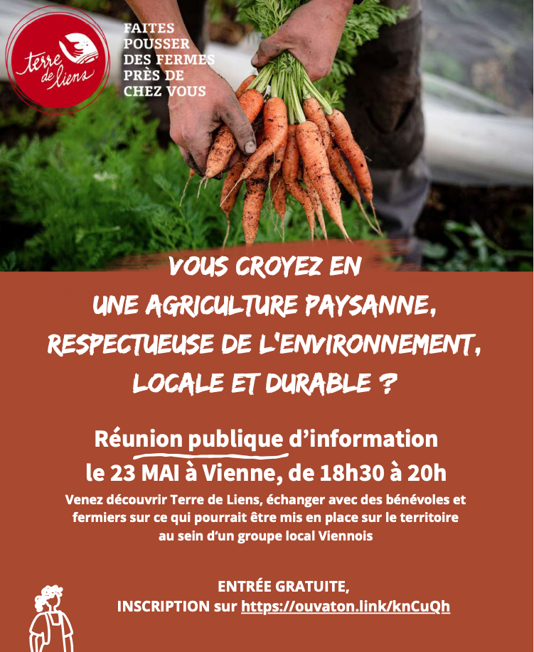 --> Venez découvrir Terre de Liens, échanger avec des bénévoles et fermiers sur ce qui pourrait être mis en place sur le territoire au sein d‘un groupe local Viennois.