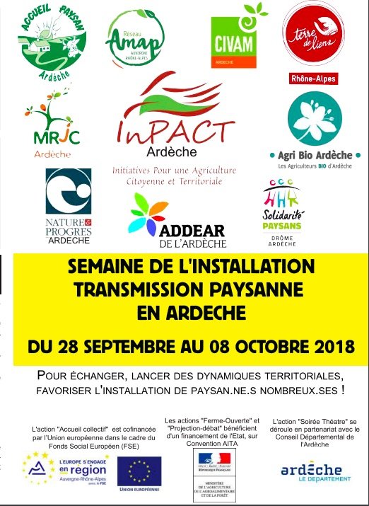 Semaine organisée par INPACT 07 pour échanger, lancer des dynamiques territoriales, favoriser l’installation de paysan.ne.s... Débats, projections, fermes ouvertes, café installation