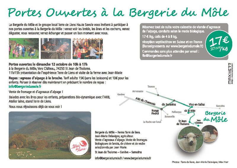 Repas : 15 euros / personne - boisson non comprise (10 euros pour les enfants). Inscrivez vous sans plus tarder en indiquant le nombre de repas : info(at)bergeriedumole.fr