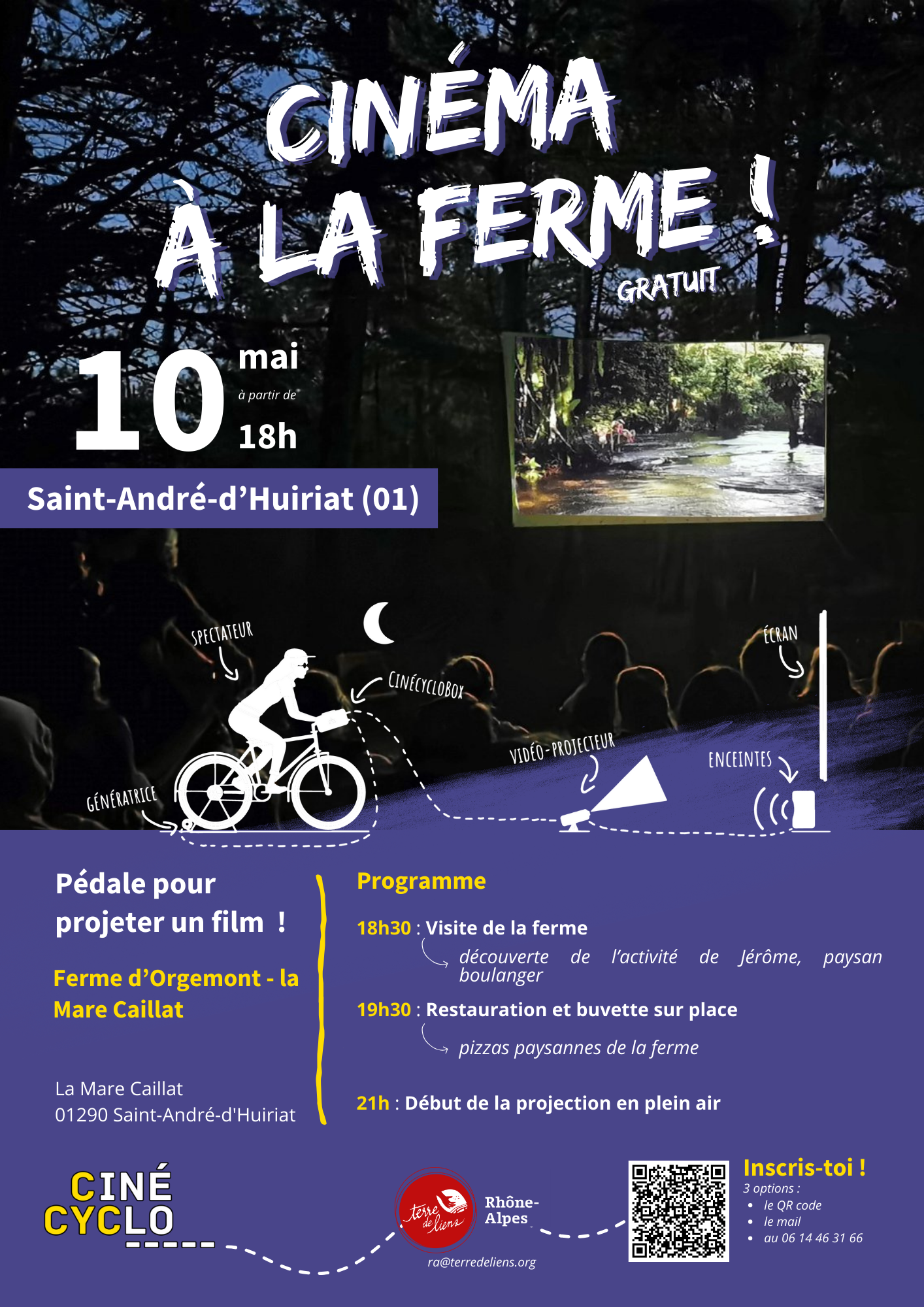 Terre de Liens Bourgogne-Franche-Comté et Terre de Liens Rhône-Alpes proposent avec l'association Cinécyclo une tournée de 4 projections en plein air dans 4 fermes allant de la Côte-d'Or à l'Ain en passant par la Saône-et-Loire les 7, 8, 9 et 10 mai 2025.