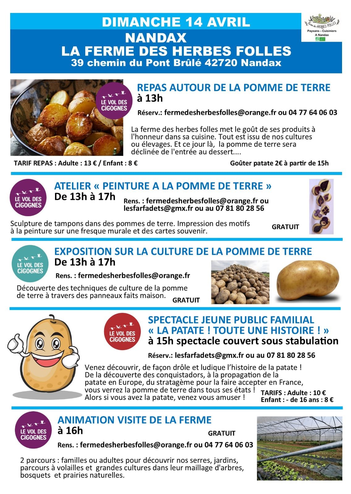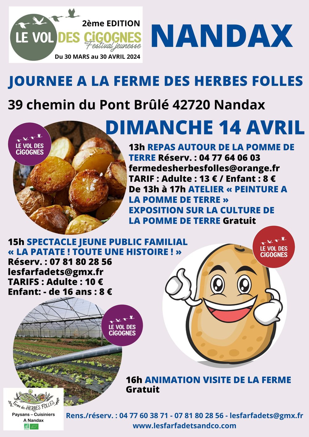 Dimanche 14 avril 2024, découvrez la La Ferme des Herbes Folles à l'occasion de la Fête de la Pomme de Terre, organisée dans le cadre du Festival Jeunesse Le Vol des Cigognes. Voici toutes les surprises que vous réserve cette journée ↓
